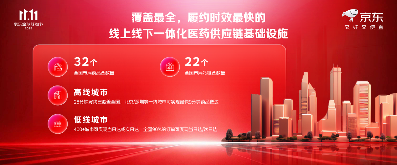 京东到家快检的服务范围已覆盖全国23城,能提供呼吸道病原等160多项检测服务;京东护士到家已覆盖全国47城,能够提供打针采血等64项专业护理服务。京东买药秒送为用户提供最快9分钟送达的即时零售体验。京东医美首家自营独立门店10月在北京国贸CBD开业,超1.1万名用户参与开业礼活动,11月到店服务名额已基本约满。另有3家京东健康体检中心在北京、深圳开业。