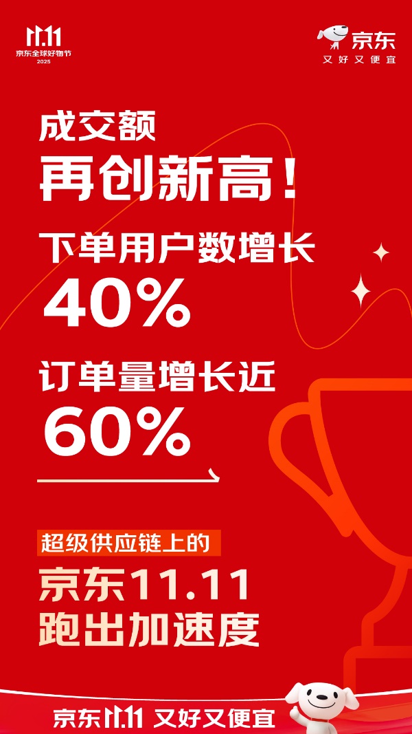 中国江苏网讯 截至2025年11月11日23:59,京东11.11成交额再创新高!下单用户数增长40%!订单量增长近60%!三方数据显示,京东APP活跃用户增长幅度稳居行业首位,在产品、价格、服务的综合体验上京东收获了最高的消费者好评度。超级供应链上的京东11.11跑出加速度!