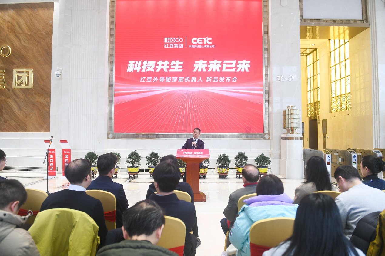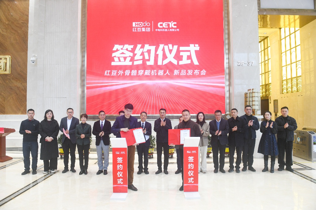 科技共生,未来以来。2月5日,红豆集团旗下无锡福芯机器人有限公司与中国电子科技集团公司旗下中电科机器人有限公司在无锡正式签约合作,并共同发布首款合作成果——轻量型髋关节助力外骨骼机器人。红豆集团董事局主席周海江出席发布会并发言。中国电科第21研究所副总工程师、机器人研发中心主任王洪武,红豆股份董事、无锡福芯机器人公司总经理奚丰作为双方代表进行签约。
